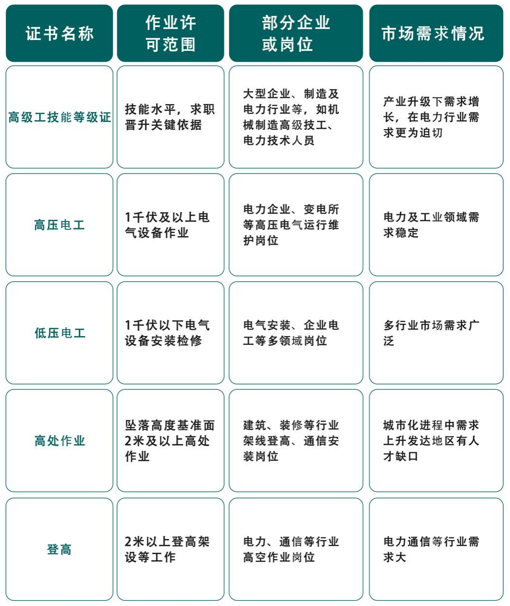 1.明確“取什么證”。通過深入調(diào)研23家企業(yè)及分析省人社廳發(fā)布的電力人才需求數(shù)據(jù),精準(zhǔn)鎖定高級工技能等級證(85%企業(yè)薪資依據(jù))、高壓電工證(電網(wǎng)作業(yè)強制要求)、低壓電工證(需求年增12%)、登高作業(yè)證(高空作業(yè)必備)、高處作業(yè)證(降低事故率60%)。這些均為國家準(zhǔn)入類資質(zhì),覆蓋電力行業(yè)92%崗位需求和80%高危作業(yè)場景,確保學(xué)生獲得的每一項資質(zhì)都能直接提升就業(yè)競爭力和職業(yè)發(fā)展空間。