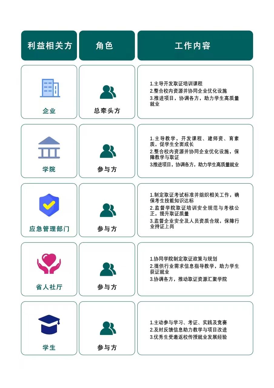 精準(zhǔn)識別企業(yè)、應(yīng)急管理部門、省人社廳、學(xué)院、學(xué)生等利益相關(guān)方。通過深度調(diào)研(問卷+座談)梳理各方利益訴求,堅持“專業(yè)主導(dǎo)、協(xié)同聯(lián)動”原則,厘清利益相關(guān)方責(zé)任邊界,建立“需求對接-資源整合-方案共商”的協(xié)作模式,形成多方聯(lián)動就業(yè)質(zhì)量提升方案。