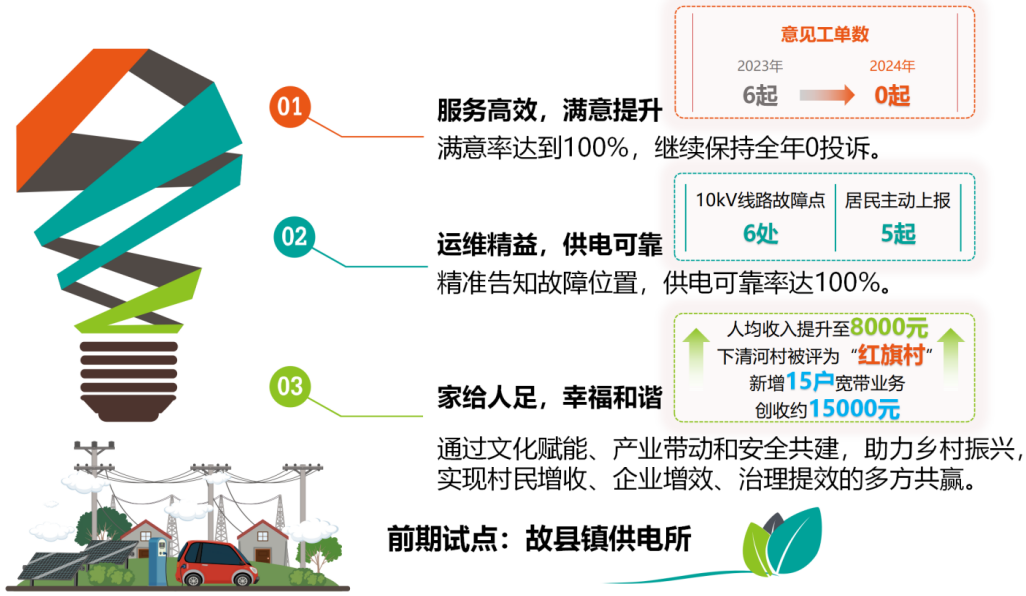 電桿文化宣傳,使居民掌握基本的安全用電、用網(wǎng)知識,電力設(shè)施外力破壞同比降低90%;學(xué)會對簡單故障的排查與處理,節(jié)約公司運維成本,如果按照平均往返15公里計算,每次可以節(jié)約油費11.25元。項目實施以后,該地區(qū)10千伏線路6處故障點,有5起為居民主動上報,并精準(zhǔn)告知網(wǎng)格經(jīng)理故障位置,縮短尋找時間,節(jié)約費用約3500元左右,2024年供電可靠率達到100%。通信公司通過宣傳減少線路私拉亂接率70%,網(wǎng)絡(luò)故障率同比下降30%,節(jié)約費用約9000元,在該村新增15戶寬帶業(yè)務(wù)辦理,增加約15000元營業(yè)收入。