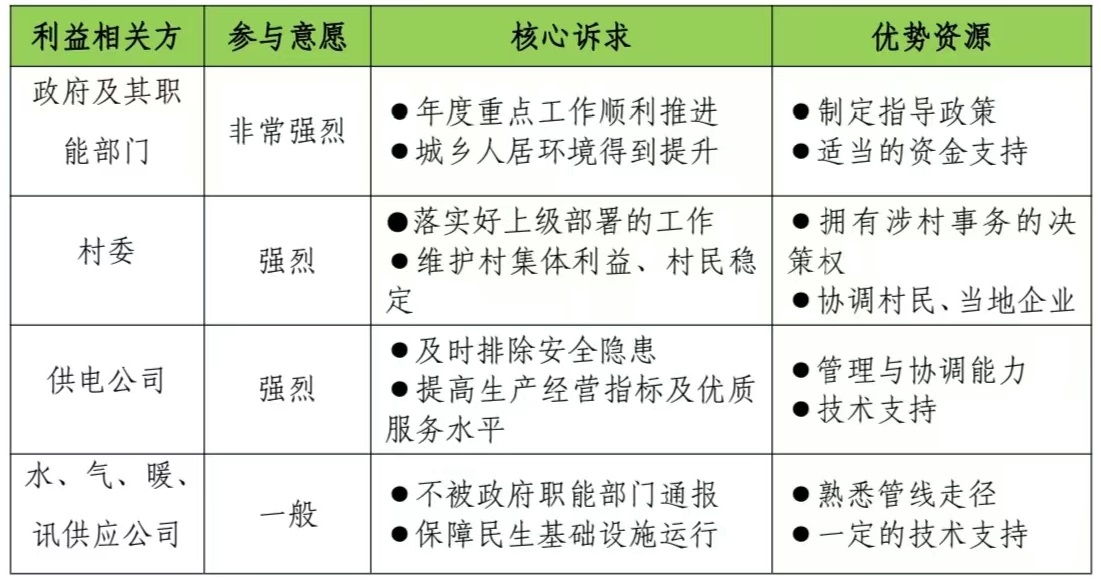 轉(zhuǎn)變以往單打獨(dú)斗的固有工作方式,識別農(nóng)村配電規(guī)劃建設(shè)有關(guān)的利益相關(guān)方,分析其訴求、資源優(yōu)勢,充分考慮其合理建議、期望和訴求,找到各方利益相關(guān)方的聯(lián)結(jié)點(diǎn),形成“政府主導(dǎo)、供電公司推動、水氣暖訊企業(yè)協(xié)同配合、客戶受益、多方共贏”的推進(jìn)模式。