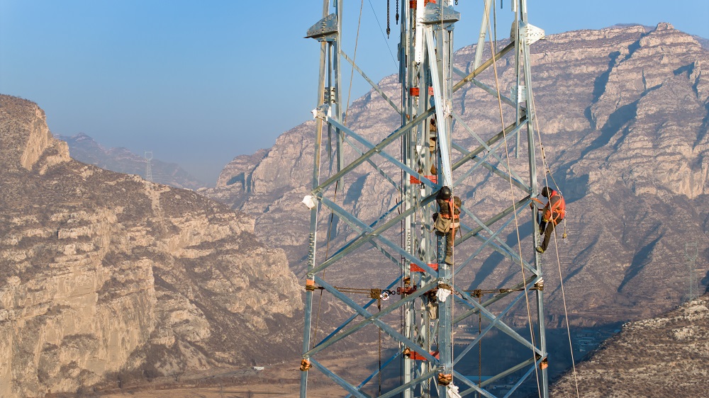 1月1日,國(guó)網(wǎng)山西送變電公司施工人員堅(jiān)守施工現(xiàn)場(chǎng),在500千伏忻州北-陽(yáng)泉線路工程開(kāi)展落地雙搖臂抱桿組塔作業(yè)。